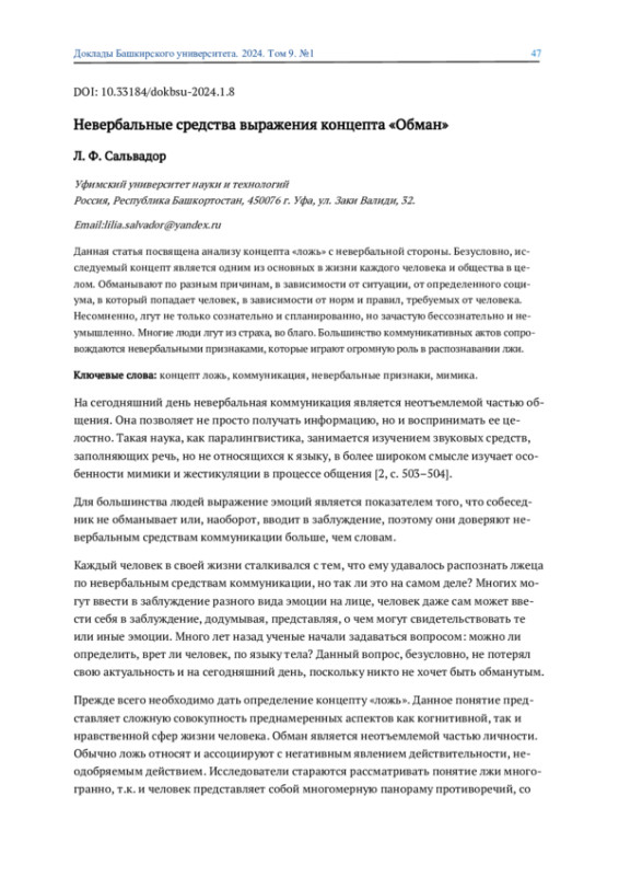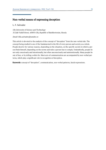 Данная статья посвящена анализу концепта «ложь» с невербальной стороны. Безусловно, исследуемый концепт является одним из основных в жизни каждого человека и общества в целом. Обманывают по разным причинам, в зависимости от ситуации, от определенного социума, в который попадает человек, в зависимости от норм и правил, требуемых от человека. Несомненно, лгут не только сознательно и спланированно, но зачастую бессознательно и неумышленно. Многие люди лгут из страха, во благо. Большинство коммуникативных актов сопровождаются невербальными признаками, которые играют огромную роль в распознавании лжи.