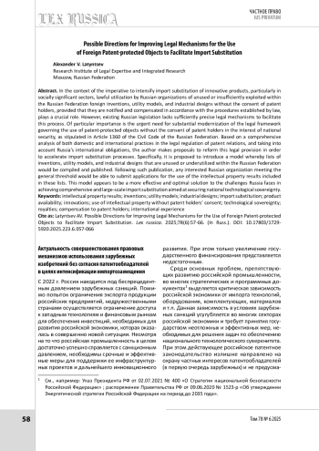 В условиях необходимости интенсификации импортозамещения инновационной продукции, в первую очередь в социально значимых сферах, особую роль приобретает возможность правомерного применения российскими организациями не используемых или недостаточно используемых в Российской Федерации зарубежных изобретений, полезных моделей и промышленных образцов без согласия патентообладателей с извещением их и выплатой вознаграждения в установленном законодательством порядке. Однако в российских нормативных актах недостаточно конкретизированы необходимые для этого правовые механизмы. Особого внимания заслуживает необходимость существенной модернизации правового инструментария использования по решению российского Правительства объектов патентной охраны без согласия патентообладателей в интересах национальной безопасности (ст. 1360 ГК РФ). По результатам комплексного анализа отечественного и зарубежного опыта правового регулирования патентных правоотношений, а также с учетом международных обязательств Российской Федерации были разработаны предложения по модернизации данной правовой нормы с целью интенсификации процессов импортозамещения. Так, предложено ввести модель, при которой формируются перечни не используемых или недостаточно используемых на территории Российской Федерации изобретений, полезных моделей и промышленных образцов, после публикации которых любые заинтересованные российские организации, соответствующие общим установленным критериям, смогут подать заявки об использовании включенных в них результатов интеллектуальной деятельности. Данная модель представляется более эффективной и оптимальной для решения стоящих перед Россией задач по комплексному и широкомасштабному импортозамещению с целью решения задач по обеспечению национального технологического суверенитета.