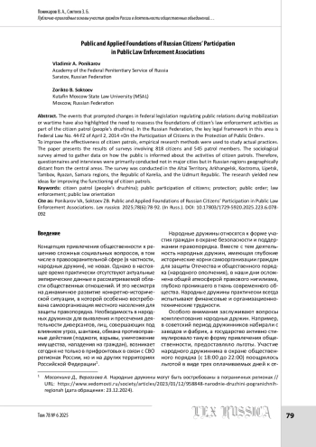 События, послужившие основанием для изменения федерального законодательства, регламентирующего общественные отношения, складывающиеся в период мобилизации или в военное время, актуализируют также потребность в пересмотре основ правоохранительной деятельности граждан в составе народной дружины. В Российской Федерации базовым нормативным актом в этой сфере является Федеральный закон от 02.04.2014 № 44-ФЗ «Об участии граждан в охране общественного порядка». В целях совершенствования деятельности народных дружинников использованы эмпирические методы исследования фактически складывающихся отношений. В статье приведены результаты опроса 818 граждан и 545 народных дружинников. Социологическое анкетирование было рассчитано на получение сведений об особенностях информирования общественности о результатах деятельности народных дружин. Поэтому анкеты были направлены в первую очередь не в мегаполисы, а в субъекты РФ, удаленные территориально от центральных регионов России. Опрос проводился в Алтайском крае, Архангельской, Костромской, Липецкой, Тамбовской, Рязанской, Самарской областях, Республике Карелии, Удмуртской Республике. Научным итогом стали новые идеи, затрагивающие вопросы совершенствования деятельности народных дружин.