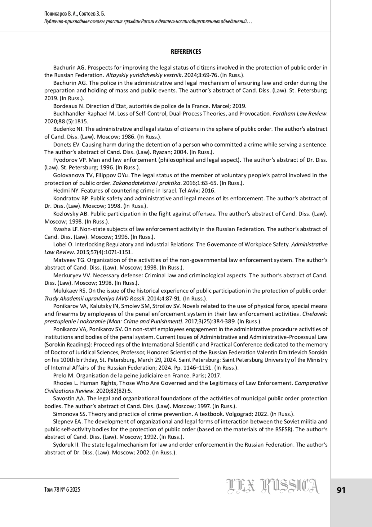 1. Бачурин А. Г. Перспективы совершенствования правового статуса граждан, участвующих в охране общественного порядка в Российской Федерации // Алтайский юридический вестник. 2024. № 3. С. 69-76.