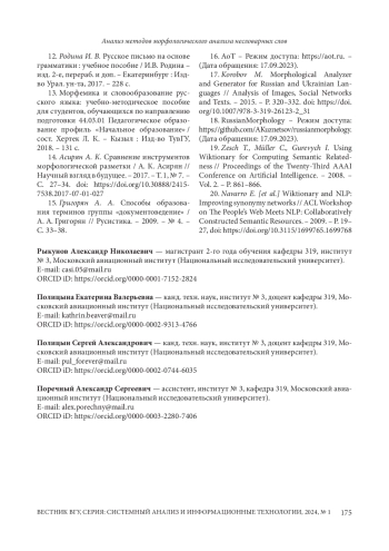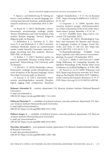 8. Рыкунов А. Н. Исследование инструментов морфологического анализа текстов на русском языке для повышения точности алгоритмов обработки в библиотеке JMorfSdk / А. Н. Рыкунов, E. В. Полицына, С. А. Поли-цын, А. С. Поречный // Информатика: проблемы, методы, технологии. - 2022. - С. 12041212. EDN: QKISHK