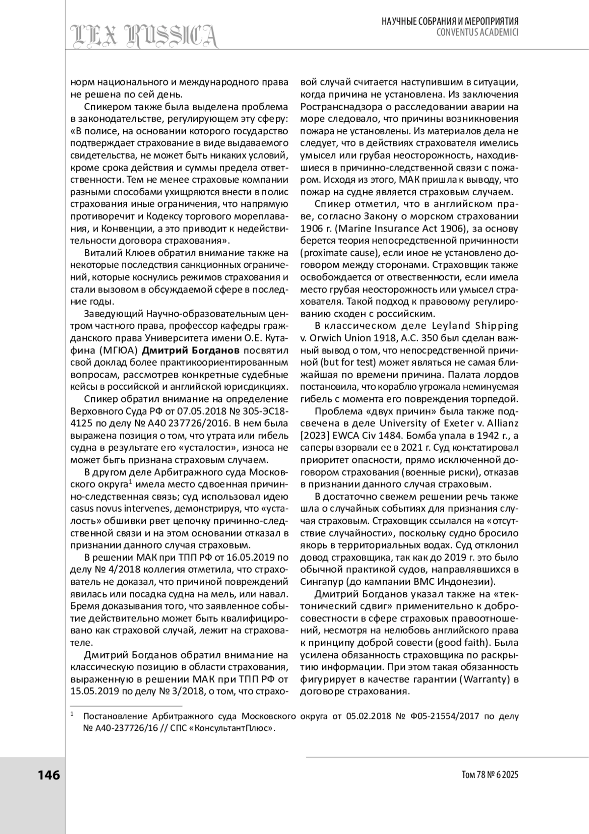 В статье дан обзор панельной дискуссии «Морское страхование: как не разбиться о скалы?», прошедшей 26 марта 2025 г. Модератором дискуссии выступил заведующий кафедрой морского права Университета имени О. Е. Кутафина (МГЮА) Михаил Кротов. В рамках панельной дискуссии обсуждались важные и острые вопросы в области морского страхования и морского права в целом. В дискуссии приняли участие представители профессионального юридического сообщества, заинтересованные в развитии отношений в области морского права. Спикеры анализировали особенности национального регулирования, международные акты, обсуждали способы и средства преодоления выявленных несовершенств и оптимальные модели правового регулирования. Была создана необходимая площадка для конструктивного и продуктивного диалога, результаты которого могут быть положены в основу дорожной карты по реформированию специального регулирования.
