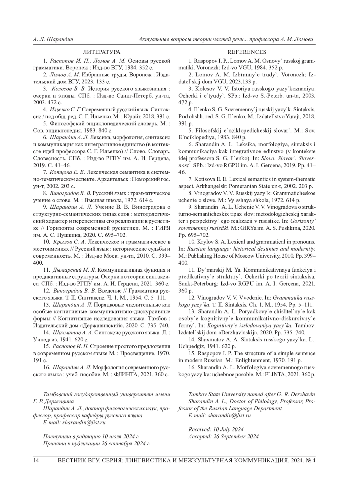 13. Шарандин А. Л. Порядковые числительные как особые когнитивные коммуникативно-дискурсивные формы // Когнитивные исследования языка. Тамбов: Издательский дом “Державинский”, 2020. С. 735-740.