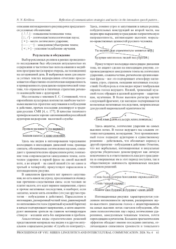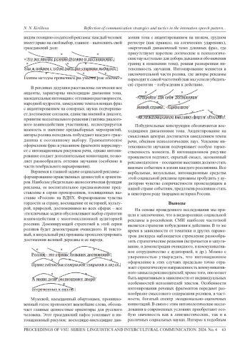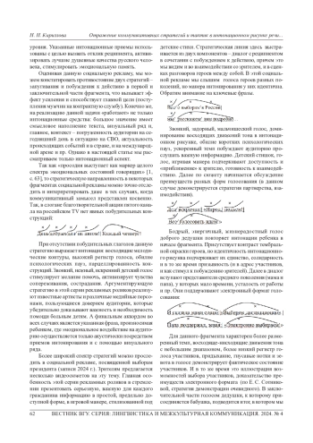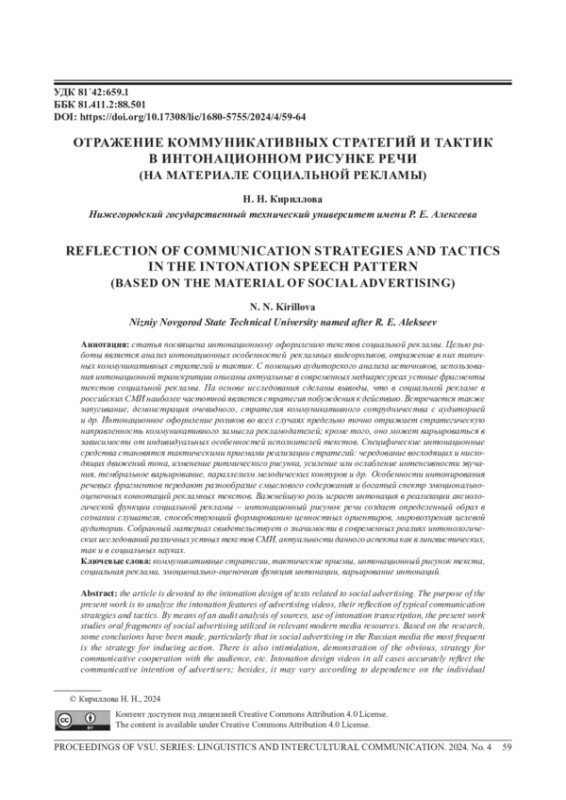 Статья посвящена интонационному оформлению текстов социальной рекламы. Целью работы является анализ интонационных особенностей рекламных видеороликов, отражение в них типичных коммуникативных стратегий и тактик. С помощью аудиторского анализа источников, использования интонационной транскрипции описаны актуальные в современныхмедиаресурсахустные фрагменты текстов социальной рекламы. На основе исследования сделаны выводы, что в социальной рекламе в российских СМИ наиболее частотной является стратегия побуждения к действию. Встречается также запугивание, демонстрация очевидного, стратегия коммуникативного сотрудничества с аудиторией и др. Интонационное оформление роликов во всех случаях предельно точно отражает стратегическую направленность коммуникативного замысла рекламодателей; кроме того, оно может варьироваться в зависимости от индивидуальных особенностей исполнителей текстов. Специфические интонационные средства становятся тактическими приемами реализации стратегий: чередование восходящих и нисходящих движений тона, изменение ритмического рисунка, усиление или ослабление интенсивности звучания, тембральное варьирование, параллелизм мелодических контуров и др. Особенности интонирования речевых фрагментов передают разнообразие смыслового содержания и богатый спектр эмоциональнооценочных коннотаций рекламных текстов. Важнейшую роль играет интонация в реализации аксиологической функции социальной рекламы - интонационный рисунок речи создает определенный образ в сознании слушателя, способствующий формированию ценностных ориентиров, мировоззрения целевой аудитории. Собранный материал свидетельствует о значимости в современных реалиях интонологических исследований различныхустных текстов СМИ, актуальности данного аспекта как в лингвистических, так и в социальных науках.