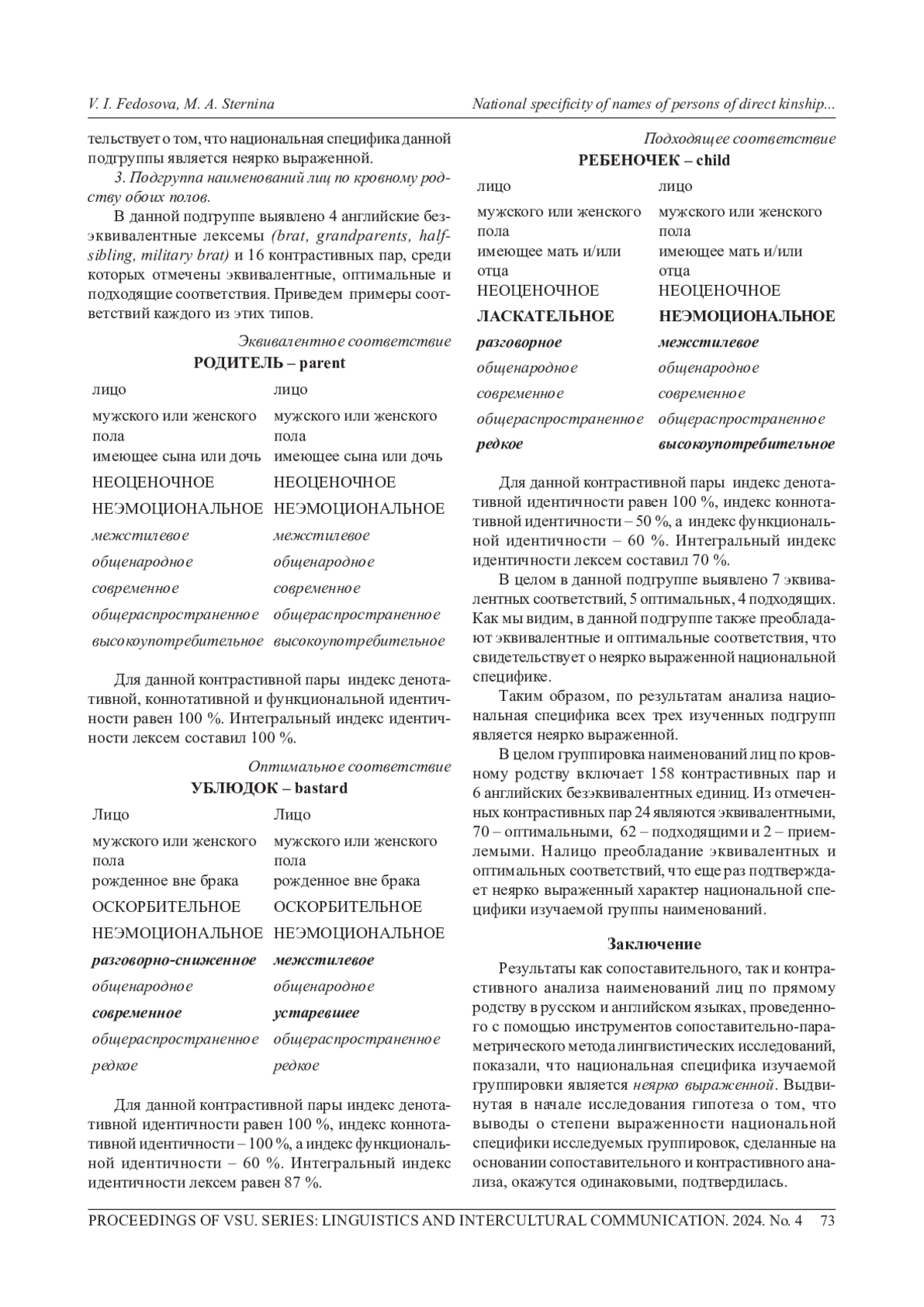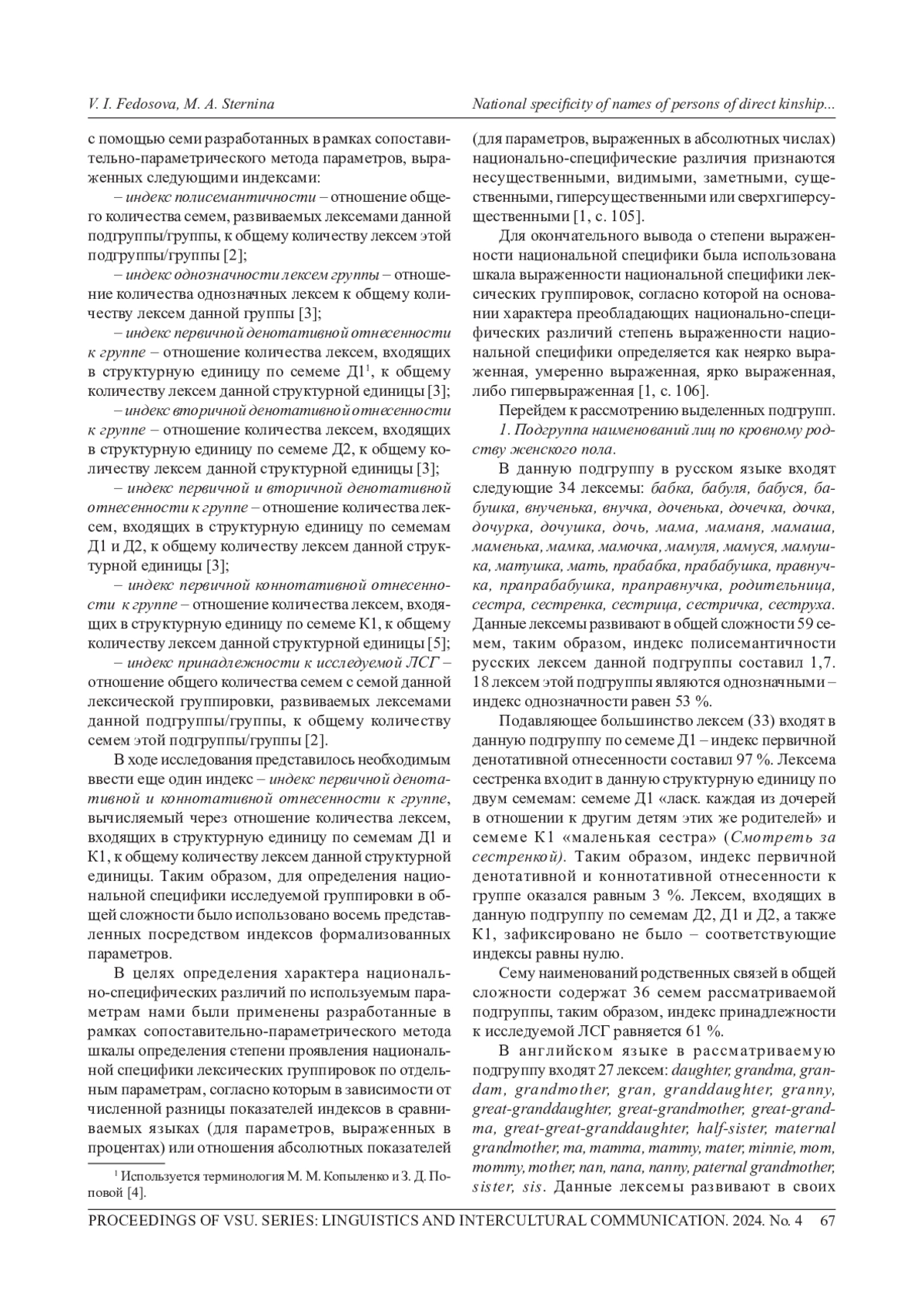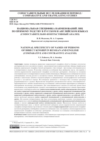 Статья посвящена выявлению национальной специфики одной из базовых лексических группировок русского и английского языков - наименований лиц по прямому родству. Авторы ставят целью выявить национальную специфику данной группировки с двух позиций - при помощи сопоставительного и контрастивного анализа. В качестве гипотезы исследования была выдвинута мысль, что выводы о степени выраженности национальной специфики исследуемых группировок, сделанные на основании сопоставительного и контрастивного анализа, будут одинаковыми. Материалом исследования послужили субстантивные лексемы русского и английского языков, обозначающие наименования лиц по прямому родству и извлеченные методом сплошной выборки из авторитетных лексикографических источников русского и английского языков. Исследование проведено с помощью двух основных процедур разрабатываемого в рамках Воронежской теоретико-лингвистической школы сопоставительнопараметрического метода лингвистических исследований: индексализации параметров исследования и шкалирования полученных результатов. Для сопоставительного анализа исследуемой группы были использованы семь разработанных в рамках сопоставительно-параметрического метода параметров, выраженных следующими индексами: индекс полисемантичности, индекс однозначности лексем группы, индекс первичной денотативной отнесенности к группе, индекс вторичной денотативной отнесенности к группе, индекс первичной и вторичной денотативной отнесенности к группе, индекс первичной коннотативной отнесенности к группе, индекс принадлежности к исследуемой ЛСГ, а также введенный авторами индекс первичной денотативной и коннотативной отнесенности к группе. Для анализа контрастивных пар были использованы введенные в рамках сопоставительнопараметрического метода индексы денотативной, коннотативной и функциональной идентичности лексем, а также интегральный индекс идентичности лексем. Применение данных индексов и соответствующих шкал, а также предложенной авторами шкалы выраженности национальной специфики контрастивных пар позволило сделать вывод о неярко выраженной национальной специфике изученной группировки и подтвердило гипотезу исследования о том, что выводы о степени выраженности национальной специфики исследуемых группировок, сделанные на основании сопоставительного и контрастивного анализа, окажутся одинаковыми.