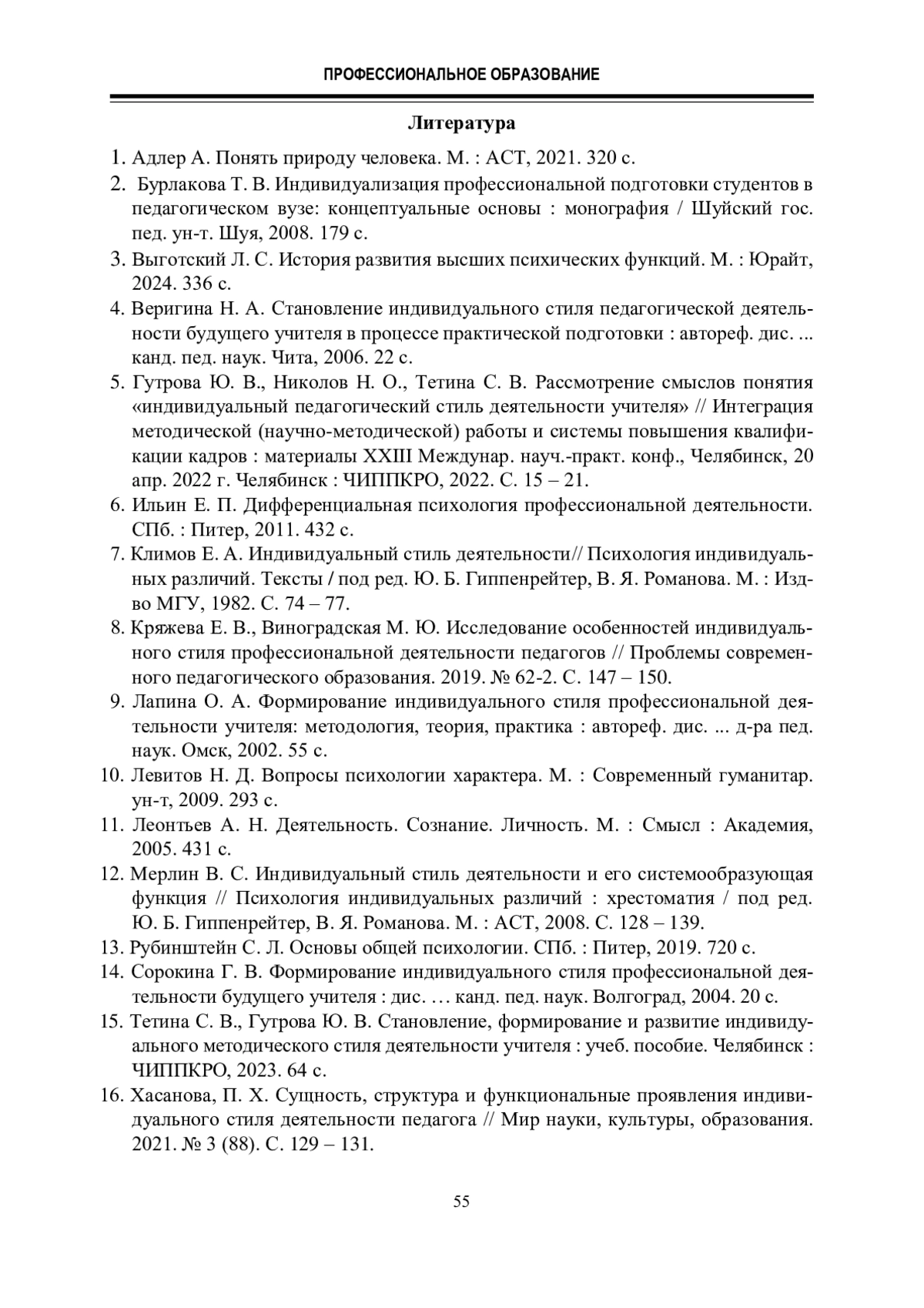 15. Тетина С. В., Гутрова Ю. В. Становление, формирование и развитие индивидуального методического стиля деятельности учителя : учеб. пособие. Челябинск : ЧИППКРО, 2023. 64 с.
