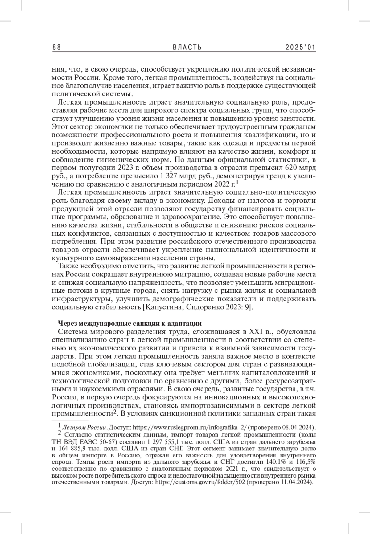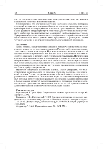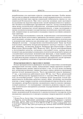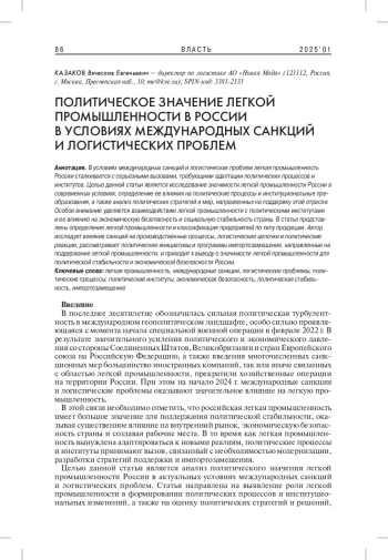В условиях международных санкций и логистических проблем легкая промышленность России сталкивается с серьезными вызовами, требующими адаптации политических процессов и институтов. Целью данной статьи является исследование значимости легкой промышленности России в современных условиях, определение ее влияния на политические процессы и институциональные преобразования, а также анализ политических стратегий и мер, направленных на поддержку этой отрасли. Особое внимание уделяется взаимодействию легкой промышленности с политическими институтами и ее влиянию на экономическую безопасность и социальную стабильность страны. В статье представлены определение легкой промышленности и классификация предприятий по типу продукции. Автор исследует влияние санкций на производственные процессы, логистические цепочки и политические реакции, рассматривает политические инициативы и программы импортозамещения, направленные на поддержание легкой промышленности и приходит к выводу о значимости легкой промышленности для политической стабильности и экономической безопасности России.