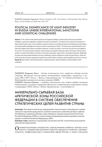 Настоящей статьей авторы предпринимают попытку анализа согласованности и взаимосвязанности перспектив промышленного освоения и вовлечения в хозяйственный оборот наиболее востребованных народным хозяйством страны минерально-сырьевых ресурсов Арктической зоны Российской Федерации (АЗРФ) со стратегическими направлениями развития важнейших отраслей народного хозяйства Российской Федерации до 2035 г.