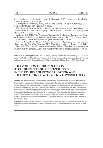 В статье рассматривается проблематика фактического неравенства объемов суверенитета национальных государств при их формальном равенстве в соответствии с принципами международного права. Очерчиваются различия между фиктивным и реальным суверенитетом, приводятся примеры глобалистских концепций ограничения суверенитета национальных государств, призванных закрепить гегемонию Соединенных Штатов и коллективного Запада на международной арене. Характеризуется роль России в качестве государства, отстаивающего в международных делах сложившиеся принципы суверенитета. Подчеркивается ключевое значение национально-государственной и геополитической идентичности для обеспечения суверенитета, защиты национальных интересов и национальной безопасности. Делается вывод о возросшей актуальности изучения сущности суверенитета в условиях процессов деглобализации и формирования полицентричного мирового порядка, основными движущими силами которого выступают Россия и Китай.