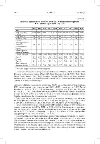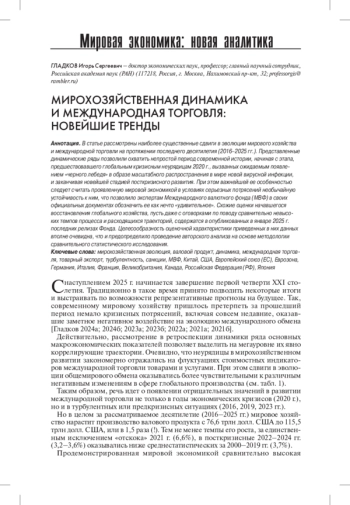 В статье рассмотрены наиболее существенные сдвиги в эволюции мирового хозяйства и международной торговли на протяжении последнего десятилетия (2016-2025 гг.). Представленные динамические ряды позволили охватить непростой период современной истории, начиная с этапа, предшествовавшего глобальным кризисным неурядицам 2020 г., вызванных ожидаемым появлением «черного лебедя» в образе масштабного распространения в мире новой вирусной инфекции, и заканчивая новейшей стадией посткризисного развития. При этом важнейшей ее особенностью следует считать проявленную мировой экономикой в условиях серьезных потрясений необычайную устойчивость к ним, что позволило экспертам Международного валютного фонда (МВФ) в своих официальных документах обозначить ее как нечто «удивительное». Схожие оценки начавшегося восстановления глобального хозяйства, пусть даже с оговорками по поводу сравнительно невысоких темпов процесса и расходящихся траекторий, содержатся в опубликованных в январе 2025 г. последних релизах Фонда. Целесообразность оценочной характеристики приведенных в них данных вполне очевидна, что и предопределило проведение авторского анализа на основе методологии сравнительного статистического исследования.