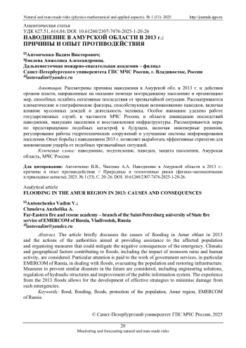 Рассмотрены причины наводнения в Амурской обл. в 2013 г. и действия органов власти, направленные на оказание помощи пострадавшему населению и организацию мер, способных ослабить негативные последствия от чрезвычайной ситуации. Рассматриваются климатические и географические факторы, способствующие возникновению паводков, включая влияние муссонных дождей и деятельность человека. Особое внимание уделено работе государственных служб, в частности МЧС России, в области ликвидации последствий наводнения, эвакуации населения и восстановления инфраструктуры. Рассматриваются меры по предотвращению подобных катастроф в будущем, включая инженерные решения, регулирование работы гидротехнических сооружений и улучшение системы информирования населения. Опыт борьбы с наводнением 2013 г. позволяет выработать эффективные стратегии для минимизации ущерба от подобных чрезвычайных ситуаций.