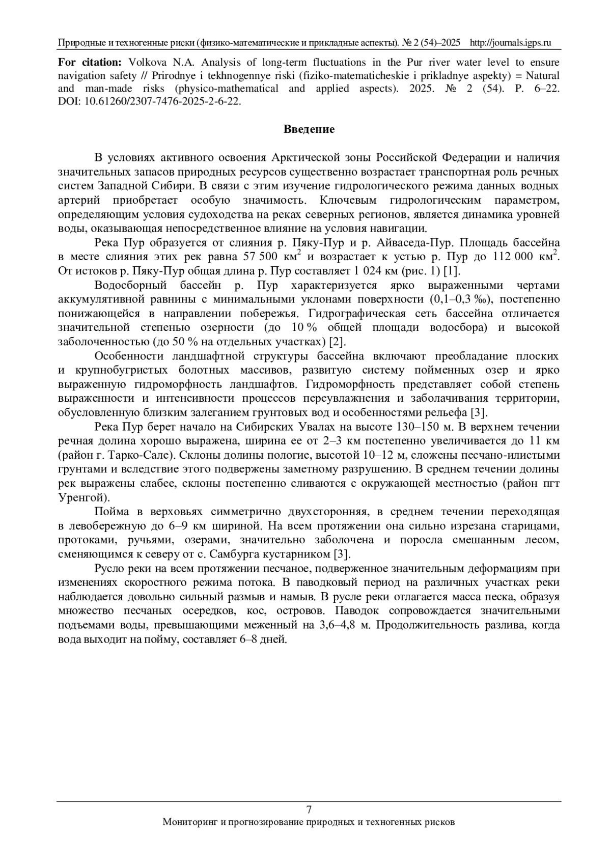 Цель исследования – анализ влияния повышенных уровней воды и выхода реки на пойму на условия судоходства, включая оценку рисков и разработку адаптационных мер. Исследование основано на анализе многолетних гидрологических данных (уровни воды) и их сопоставлении с эксплуатационными параметрами судоходства. Выявлены критические уровни воды по постам на р. Пур, при которых сокращается эффективность навигации из-за затопления знаков и смещения фарватера, скорость течения возрастает, повышая аварийность. Установлена 5–7-летняя цикличность экстремальных паводков, требующая коррекции навигационных графиков. Определены наиболее уязвимые участки (посты Тарко-Сале и Самбург), где выход на пойму приводит к ежегодным экономическим потерям. Исследование показывает необходимость интеграции гидрологического мониторинга и управленческих решений для минимизации рисков в условиях учащения экстремальных подъемов уровня воды арктических рек.