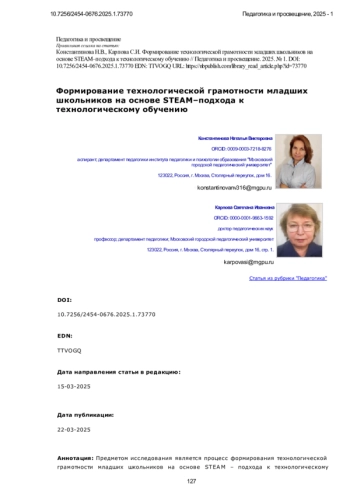1. Константинова Н.В. STEAM-подход к технологическому обучению в младшей школе: возможности и ограничения // Современная наука, актуальные вопросы науки и образования. Серия: Гуманитарные науки. 2024. № 11-2. С. 91-95.