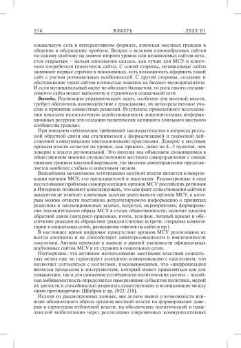 В статье показаны особенности организации коммуникации органов местного самоуправления и населения в условиях ускоренной цифровизации, основные рамки которой были заложены в федеральном законе «Об обеспечении доступа к информации о деятельности государственных органов и органов местного самоуправления». Авторы рассматривают эффективную коммуникацию как один из факторов легитимации местного самоуправления, показателем которого выступает доверие. Контент-анализ сайтов и страниц местных администраций в социальных сетях позволил сделать вывод, что форсированное создание интернет-ресурсов пока не привело к повсеместному качественному обмену информацией между властью и обществом. Исследование выявило несущественные региональные различия в плане функционирования официальных сайтов и страниц в социальных сетях муниципальных органов власти. Опираясь на эмпирические данные всероссийского мониторинга о динамике уровня доверия к местной власти, авторы делают вывод, что доверие к местной власти коррелирует с оценками уровня развития МСУ в стране. При этом коммуникация между властью и населением как механизм легитимации МСУ оценивается как низкоэффективная.