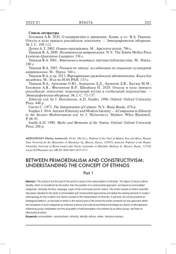 Данная статья является первой частью авторского исследования интерпретации этничности. Объектом изучения выступает этническая идентичность, которую автор рассматривает с позиции конструктивистского подхода, но с опорой на примордиалистские категории, в числе которых территория, язык, происхождение сообщества и его культура. В статье раскрывается современная научная дискуссия, посвященная столкновению примордиалистского и конструктивистского подходов, и констатируется существующий в современной антропологии запрос на создание гибридной концепции интерпретации этничности. В целом, статья представляет идейную платформу, на базе которой уже во второй части автор представляет собственный подход, в рамках которого в качестве фактора этногенеза, влияющего на групповую мобилизацию и обретение этнической группой самовосприятия этноса, а затем - этнокультурной нации, рассматриваются такие категории, как «историческая память» и «культурно-историческое наследие».