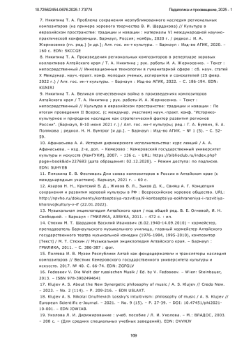 8. Никитина Т. А. Произведения региональных композиторов в репертуаре хоровых коллективов Алтайского края / Т. А. Никитина; рук. работы И. А. Жерносенко. - Текст: непосредственный // Инновационные технологии в гуманитарной сфере: сб. науч. статей X Междунар. науч.-практ. конф. молодых ученых, аспирантов и соискателей (25 февр. 2022 г.) / Алт. гос. ин-т культуры. - Барнаул: Изд-во АГИК, 2022. - С. 186-194. EDN: KGNIRJ