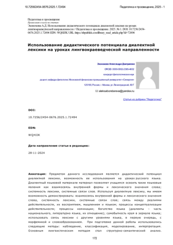 Предметом данного исследования является дидактический потенциал диалектной лексики, возможность ее использования на уроках русского языка. Диалектный языковой материале материал позволяет учащимся освоить такие языковые явления как взаимосвязь внутренней формы и лексического значения слова; системность лексики, системные связи слов. Используя диалектную лексику, мы имеем возможность демонстрировать: взаимосвязь внутренней формы и лексического значения слова, системность лексики, системные связи слов; связь между реалиями действительности, их восприятием, мышлением и языком; процессы концептуализации действительности; процессы номинации; богатство языка (диалекты - часть национального, литературно языка, их отношение); самобытность края в зеркале языка; использовать связь лексики с другими уровнями языка, в первую очередь, с морфемикой и словообразованием. При подготовке данной работы использовались следующие методы: наблюдение, классификация, моделирование, интерпретация. Основным лингвистическим методом стал структурно-семантический анализ. Многоаспектное изучение региональных особенностей в образовательных учреждениях - часть государственной образовательной политики, направленной на формирование национального патриотического самосознания учащихся. Новизна исследования заключается в актуализации диалектного материала, ранее не становившегося объектом дидактических разработок. В работе на конкретных примерах раскрывается дидактический потенциал диалектной лексики. Лингвистический анализ диалектной лексики позволяет сделать вывод о том, что использование ее на уроках лингвокраеведческой направленности позволит решить не только собственно лексикологические задачи (познакомить с понятием и значением диалекта), но и сформировать целый ряд лингвистических компетенций. Практическое применение перечисленным качествам исследуемого языкового материала находит применение в системе упражнений, представленных такими видами как чисто лексические, логико-лексические, а также синтетические.