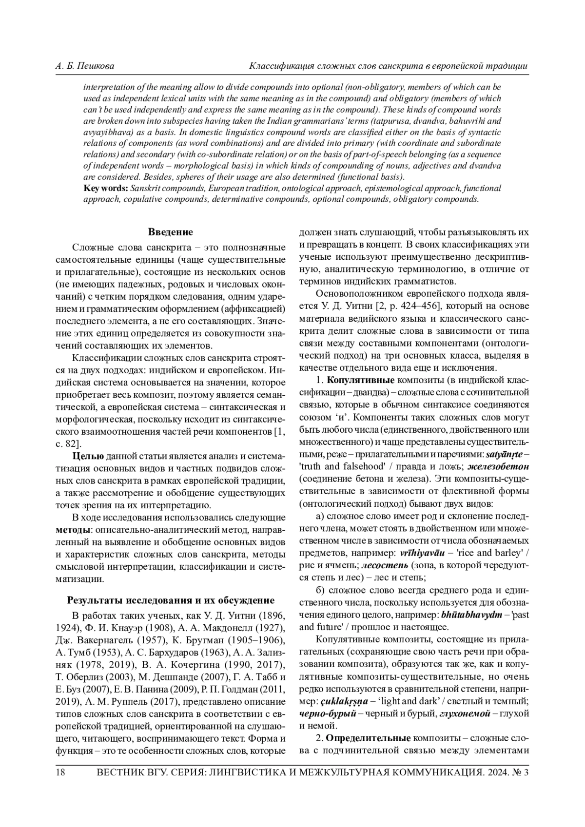 Статья посвящена рассмотрению и анализу основных видов и частных подвидов сложных слов санскрита в европейской традиции, которая представляет собой традицию грамматики слушающего. На основании этого форма и функция - это те особенности сложных слов, которые должен знать слушающий, чтобыразъязыковлять их и превращать в концепт. В европейской классификации представлены онтологический (анализ формы), гносеологический (объяснительный анализ, толкование значения) и функциональный (особенности функционирования) подходы к самасам. На основе синтаксической связи между составными элементами и особенностей функционирования выделяют копулятивные композиты (сложные слова с сочинительной связью), определительные композиты (с подчинительной связью), вторичные сложные прилагательные (притяжательные композиты, сложные слова с управляемым последним членом, вторичные сложные прилагательные, используемые как наречия) и неправильные сложные слова. Анализ и толкование значения позволяют разделить сложные слова на аддитивные (члены которых могут использоваться как самостоятельные лексические единицы с теми же значениями, что и в составе композита) и неаддитивные (идиоматичные, члены которых не могут использоваться самостоятельно и выражать то же значение, что и в составе сложного слова). Эти виды сложных слов подразделяют на частные подвиды, взяв за основу термины индийских грамматистов (татпуруша, двандва, бахувризи и аваябхава). В отечественном языкознании сложные слова классифицируются либо на основе синтаксической связи компонентов (как словосочинения) и делятся на первичные (с сочинительной и подчинительной связью) и вторичные (с соподчинительной связью), либо на основе частеречной принадлежности (как последовательности самостоятельных слов - морфологическое основание), в которой рассматриваются виды основосложения существительных, прилагательных и двандва, а также сферы их использования (функциональное основание).