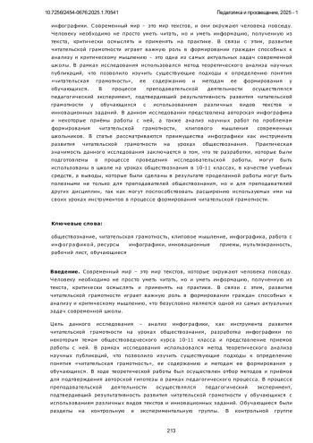 Актуальность темы исследования обусловлена глубоким кризисом в сфере чтения в российском обществе. Цель данного исследования - анализ инфографики, как инструмента развития читательской грамотности на уроках обществознания, разработка инфографики по некоторым темам обществоведческого курса 10-11 класса и представление приёмов работы с ней. Объектом исследования является преподавание обществознания, а предметом - инновационные приемы на примере использования инфографики. Современный мир - это мир текстов, и они окружают человека повсюду. Человеку необходимо не просто уметь читать, но и уметь информацию, полученную из текста, критически осмыслять и применять на практике. В связи с этим, развитие читательской грамотности играет важную роль в формировании граждан способных к анализу и критическому мышлению - это одна из самых актуальных задач современной школы. В рамках исследования использовался метод теоретического анализа научных публикаций, что позволило изучить существующие подходы к определению понятия «читательская грамотность», ее содержанию и методам ее формирования у обучающихся. В процессе преподавательской деятельности осуществлялся педагогический эксперимент, подтвердивший результативность развития читательской грамотности у обучающихся с использованием различных видов текстов и инновационных заданий. В данном исследовании представлена авторская инфографика и некоторые приёмы работы с ней, а также анализ научных работ по проблемам формирования читательской грамотности, клипового мышления современных школьников. В статье рассматриваются преимущества инфографики как инструмента развития читательской грамотности на уроках обществознания. Практическая значимость данного исследования заключается в том, что те разработки, которые были подготовлены в процессе проведения исследовательской работы, могут быть использованы в школе на уроках обществознания в 10-11 классах, в качестве учебных средств, а выводы, которые были сделаны в результате проделанной работы могут быть полезными не только для преподавателей обществознания, но и для преподавателей других дисциплин, так как могут поспособствовать расширению используемых ими на своих уроках инструментов в процессе формирования читательской грамотности.