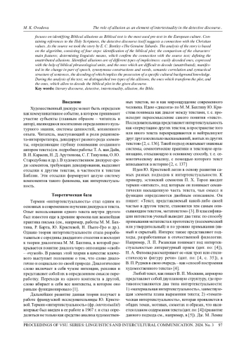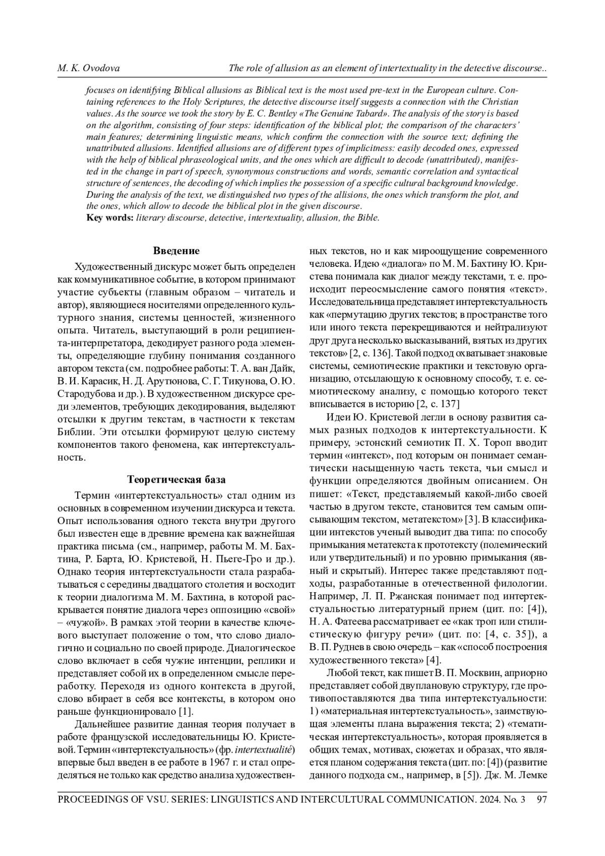 Данная статья посвящена исследованию интертекстуальных элементов в детективном дискурсе. Интертекстуальность, являясь «диалогом» двух текстов, представляет собой двуплановую структуру, разделяясь на материальную и тематическую. Данные типы интертекстуальности выражаются в заимствованиях элементов плана выражения (слово или его вариант) и плана содержания текста (сюжеты, мотивы, темы, образы) соответственно. В работе мы обращаемся к изучению тематической интертекстуальности для установления библейского сюжета, являющегося основанием детективного рассказа. Для достижения поставленной задачи анализируется аллюзия, которая, будучи одним из показателей материальной интертекстуальности, представляет собой скрытый тип заимствования элементов, по которым реципиент узнает исходный текст. В исследовании делается акцент на выявление библейских аллюзий, поскольку Библейский текст является самым используемым претекстом в европейской культуре, и сам детективный дискурс, содержа отсылки к Священному Писанию, предполагает связь с христианскими ценностями. В качестве источника материала выступает рассказ Э. К. Бентли «The Genuine Tabard». Анализ рассказа построен по алгоритму, состоящему из четырех шагов: определение библейского сюжета; сопоставление характерных черт героев; установление языковых средств, подтверждающих связь с исходным текстом; установление неатрибутированных аллюзий. Выявленные аллюзии имеют разную степень имплицитности: легко декодируемые, выраженные через библейские фразеологические единицы, и трудно декодируемые (неатрибутированные), проявляющиеся через изменение части речи, синонимичные конструкции и слова, смысловую корреляцию и синтаксическую структуру предложений, дешифровка которых требует от читателя определенного культурного фонового знания. В ходе анализа были установлены два основных типа аллюзий: способствующие трансформации библейского сюжета, и аллюзии, позволяющие реконструировать библейский сюжет в детективном дискурсе.