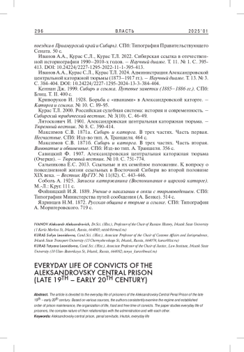 9. Иванов А.А., Курас С.Л., Курас Т.Л. 2024. Администрация Александровской центральной каторжной тюрьмы (1873-1917 гг.). - Научный диалог. Т. 13. № 3. С. 384-404. DOI: 10.24224/2227-1295-2024-13-3-384-404 EDN: NDBXRR