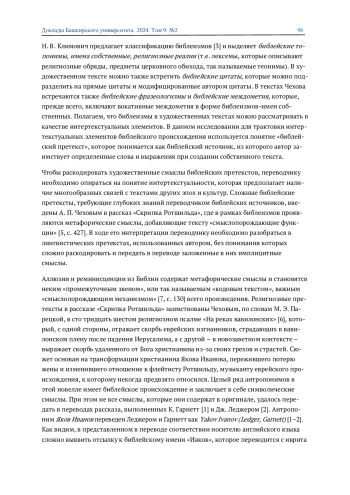Актуализация библейских претекстов, вошедших в художественную структуру рассказов А. П. Чехова, в англоязычных переводах связана с проблемой интертекстуальности, которая предполагает широкое знакомство переводчика с целым рядом заимствований из внешних источников, которые осуществлял писатель в процессе создания своих произведений. В художественных текстах Чехова используются такие библеизмы, как библейские слова, сюжеты, цитаты, которые выступают в тексте оригинала как реминисценции из Библии.