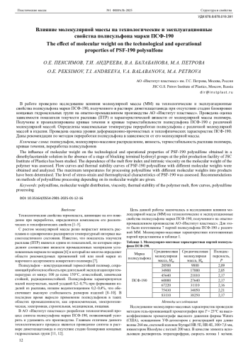 В работе проведено исследование влияния молекулярной массы (ММ) на технологические и эксплуатационные свойства полисульфона марки ПСФ-190, полученного в растворе диметилацетамида при отсутствии стадии блокировки концевых гидроксильных групп на опытно-промышленном производстве АО «Институт пластмасс». Проведена оценка зависимости показателя текучести расплава (ПТР) и характеристической вязкости от молекулярной массы полимера. Получены и проанализированы кривые течения и кривые термостабильности полисульфона ПСФ-190 с различной молекулярной массой. Определены максимальные температуры переработки полисульфона с различной молекулярной массой в изделия. Проведена оценка уровня деформационно-прочностных и теплофизических характеристик ПСФ-190. Даны рекомендации по методам переработки полисульфона в зависимости от его молекулярной массы.