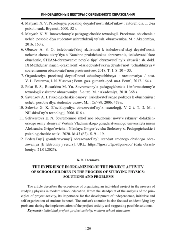 4. Матяш Н. В. Психология проектной деятельности школьников : автореф. дис. ... д-ра психол. наук. Брянск, 2000. 52 с.