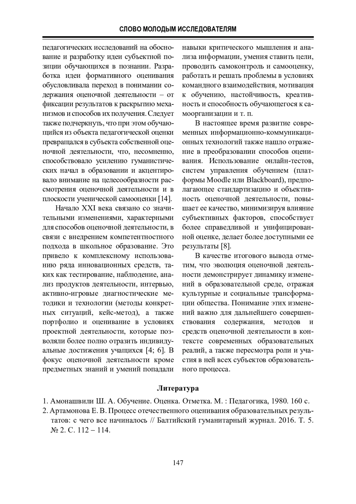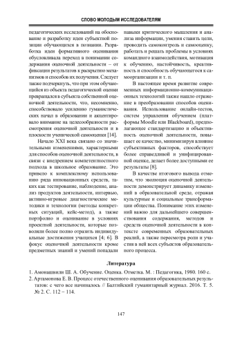 2. Артамонова Е. В. Процесс отечественного оценивания образовательных результатов: с чего все начиналось // Балтийский гуманитарный журнал. 2016. Т. 5. № 2. С. 112 - 114.