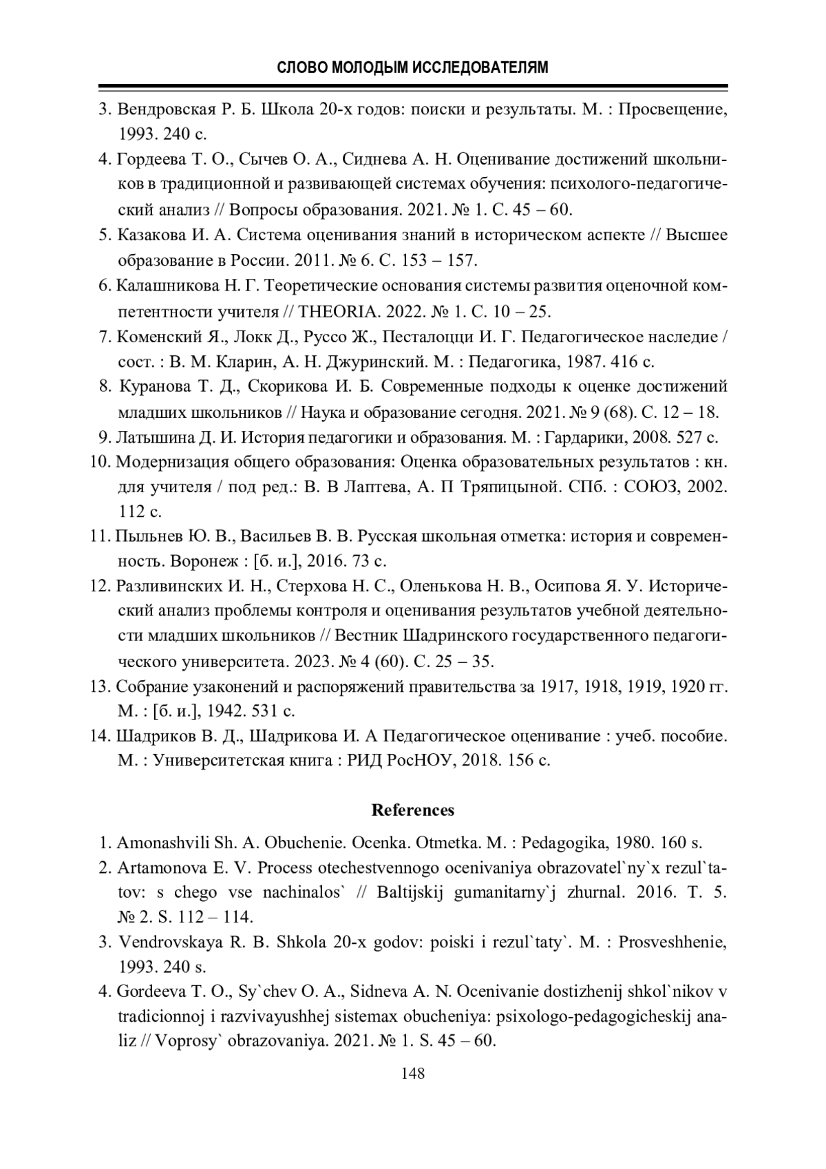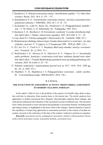 12. Разливинских И. Н., Стерхова Н. С., Оленькова Н. В., Осипова Я. У. Исторический анализ проблемы контроля и оценивания результатов учебной деятельности младших школьников // Вестник Шадринского государственного педагогического университета. 2023. № 4 (60). С. 25 - 35.