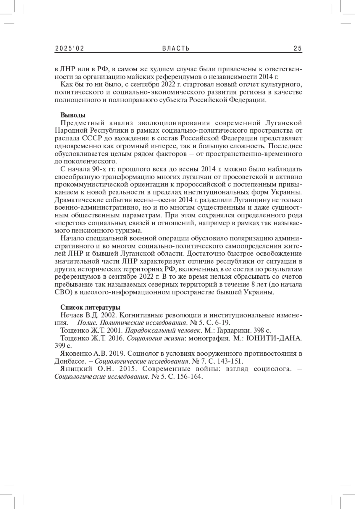 4. Яковенко А.В. 2019. Социолог в условиях вооруженного противостояния в Донбассе. - Социологические исследования. № 7. С. 143-151. EDN: LLKQEI