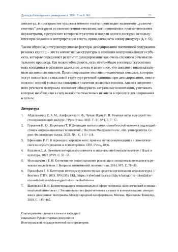 1. Абдельхамид С. А. М., Алефиренко Н. Ф., Чумак-Жунь И. И. Речевые акты и русский текстопорождающий дискурс // Русистика. 2023. Т. 21. №1. С. 7-17. EDN: YFQFRP