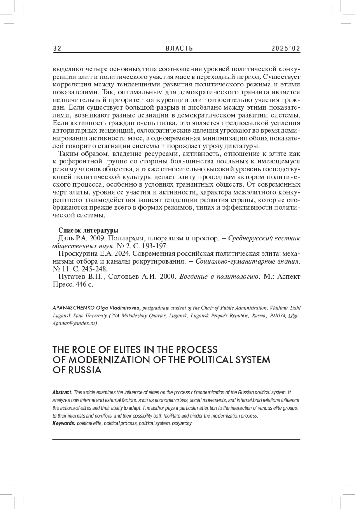 2. Проскурина Е.А. 2024. Современная российская политическая элита: механизмы отбора и каналы рекрутирования. - Социально-гуманитарные знания. № 11. С. 245-248. EDN: XLYZAI
