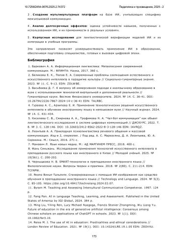 22. 黄欣宁.跨学科视角下人工智能与高校外语教学融合策略研究[J].太原城市职业技术学院学报, 2024, (11):86-88. 10.16227/j.cnki.tycs.2024.0678. (Хуан Синьнин. Стратегии интеграции искусственного интеллекта в преподавании иностранных языков в ВУЗах с междисциплинарной перспективы // Сюэбао Тайюань чэнши чжие цзишу сюэюань (Журнал Тайюаньского городского профессионально-технического института). 2024. № (11). С. 86-88).