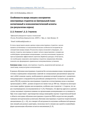 В статье представлен анализ данных опроса иностранных студентов с целью выявить когнитивные и психолингвистические особенности восприятия респондентами жанра лекции. Результаты опроса позволяют утверждать, что многие студенты-иностранцы не имеют четкого представления о лекции как особой форме организации коммуникации, а потому испытывают трудности при выстраивании эффективной стратегии обработки дискурса. Отмечается, что необходимо знакомить иностранных студентов с форматами обучения, помогать им сформировать правильные коммуникативные установки.