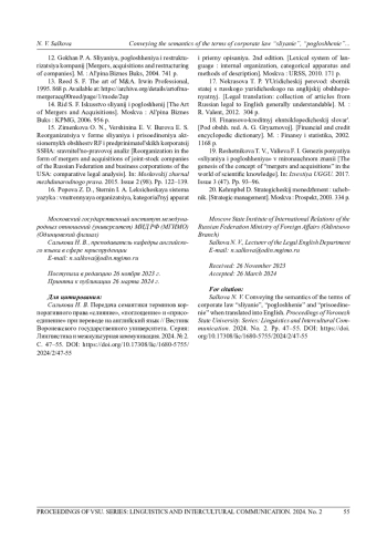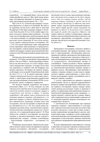 Статья имеет целью анализ способов передачи семантики терминов корпоративного права «слияние», «поглощение» и «присоединение» при переводе на английский язык. Материалом исследования послужили тексты кодексов, законов и иных нормативно-правовых актов в области корпоративного права РФ и США, учебники, учебные пособия и статьи по корпоративному праву, а также словарные статьи одноязычных и двуязычных юридических словарей. Результаты сравнительно-сопоставительного исследования показали, что правовой институт реорганизации юридического лица, известный корпоративному и налоговому праву США, существенным образом отличается от института реорганизации в рамках корпоративного права РФ. Перевод терминов «слияние» и «присоединение», обозначающих предусмотренные российским законодательством формы реорганизации, вызывает наибольшие сложности в связи с наблюдаемым сегодня семантическим сдвигом в понимании английских терминов «merger», «acquisition» и «consolidation» ввиду закрепившегося на практике варианта перевода наименования сделок по передаче корпоративного контроля «mergers and acquisitions» (M&A) как «сделки слияния и поглощения». При переводе терминов «слияние» и «присоединение», обозначающих предусмотренные российским законодательством формы реорганизации, специалистами проводятся параллели с известной американскому праву реорганизацией типа «A reorganization», объединяющей «merger or consolidation». Однако различия в объеме правовых последствий позволяют провести разграничение между семантическим наполнением термина «merger» в широком смысле, объединяющего присоединение и слияние, и термина «merger» в узком смысле, эквивалентного термину «присоединение», а также обособленно рассматривать термин «consolidation» как эквивалент термина «слияние».