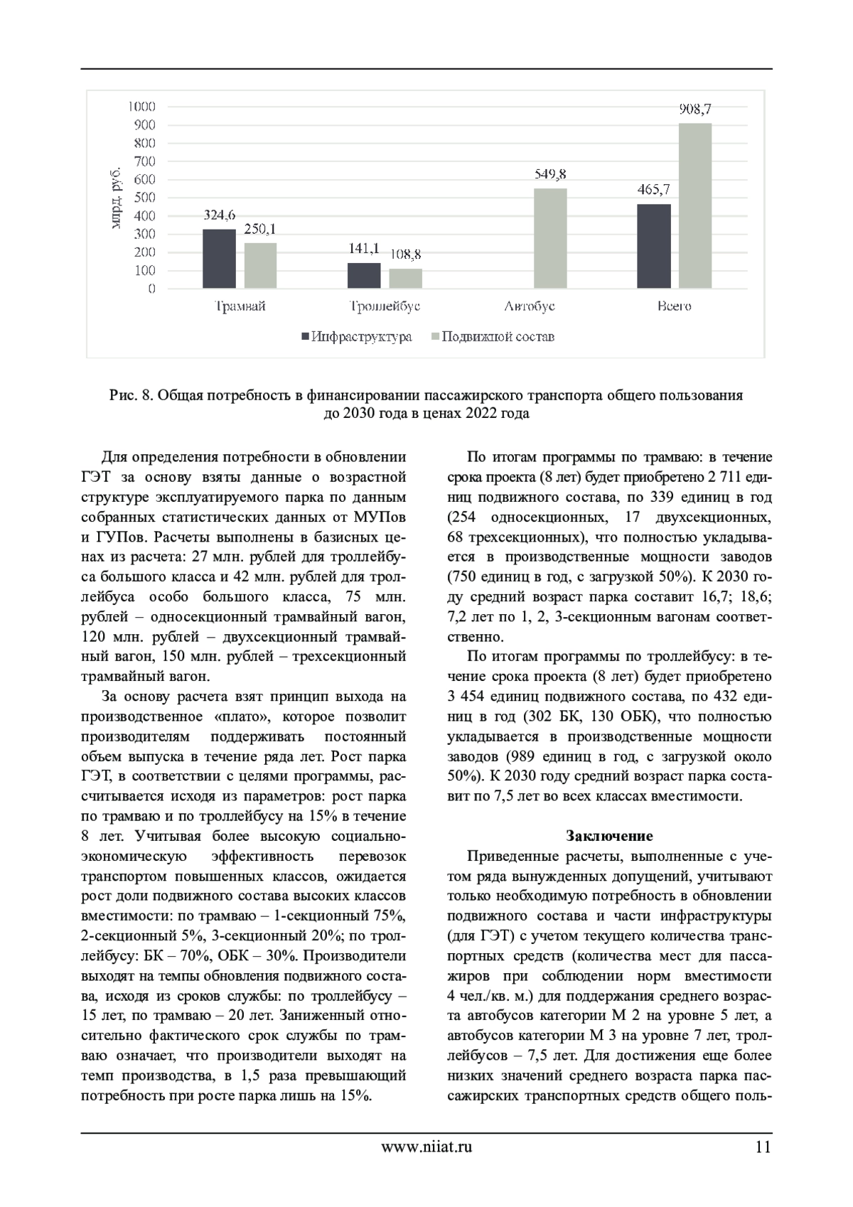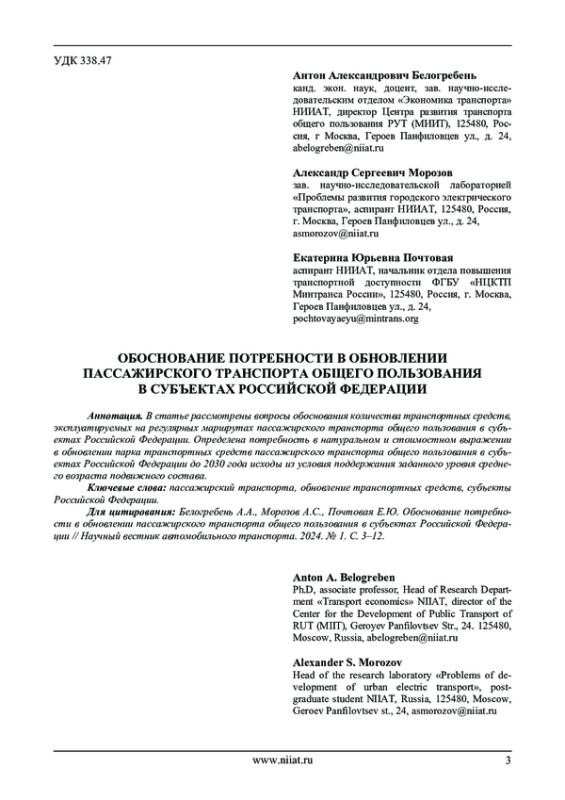 В статье рассмотрены вопросы обоснования количества транспортных средств, эксплуатируемых на регулярных маршрутах пассажирского транспорта общего пользования в субъектах Российской Федерации. Определена потребность в натуральном и стоимостном выражении в обновлении парка транспортных средств пассажирского транспорта общего пользования в субъектах Российской Федерации до 2030 года исходы из условия поддержания заданного уровня среднего возраста подвижного состава.