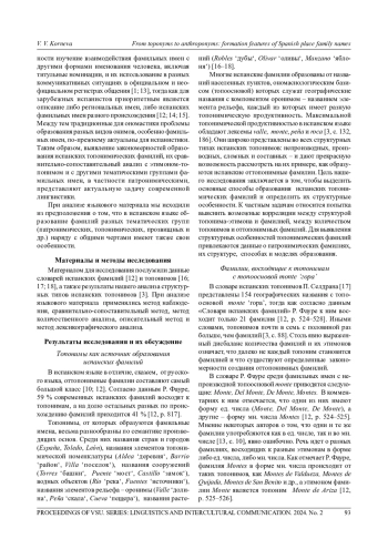 Статья посвящена проблеме создания испанских топонимических фамилий. В ней излагаются результаты исследования, цель которого заключается в выявлении особенностей образования и описании структурных моделей оттопонимных семейных имен. Сравнительно-сопоставительный анализ оттопонимных фамилий с этимоном-топонимом, его словообразовательными типами, а также с патронимическими фамилиями позволили сделать выводы об общих и частных закономерностях образования фамильных имен в испанском языке. К числу общих закономерностей относится трансонимизация онимов - личных имен в патронимических фамилиях и топонимов в оттопонимных фамилиях. Наряду с трансонимизацией в образовании патронимических фамилий задействованы синтаксические и морфологические средства (сочетание личного имени с предлогом de, а также патронимические суффиксы). Образование оттопонимных фамилий базируется исключительно на трансонимизации, действие которой зависит не столько от словообразовательной структуры топонима-этимона, сколько от формально-графической формы его представления. Топонимы-универбы (производные и сложные) становятся фамилиями без каких-либо изменений своей структуры и служат источником омонимии онимов. Непроизводные двусоставные топонимы с определенным артиклем женского рода в результате фузии становятся однословными фамилиями. Составные топонимы, имеющие форму nombre + de + nombre, при переходе в фамильное имя всегда утрачивают один из своих компонентов, либо первый nombre, либо второй de + nombre, либо связочную часть (предлог/ предлог + артикль), в результате возникают две модели - однокомпонентная nombre и двухкомпонентная de + nombre. Фамилии, созданные по однокомпонентной модели, зачастую восходят к разным этимонам - топонимам-универбам и составным топонимам, частью которых является тот же самый топоним-универб. Это является главной причиной многократного превышения топонимов-этимонов по сравнению с оттопонимными фамилиями, тогда как в патронимических фамилиях количество этимонов меньше количества фамилий. При анализе языкового материала применялись сравнительно-сопоставительный и описательный методы, а также метод количественного и лексикографического анализа.
