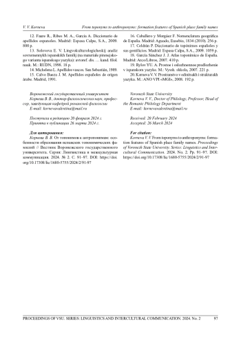 13. Соловьева Е. В. Лингвокультурологический анализ современных испанских фамилий (на материале пиренейского варианта испанского языка): автореф. дис.. канд. филол. наук. М.: РУДН, 1998. 18 с. EDN: ZKRYNF
