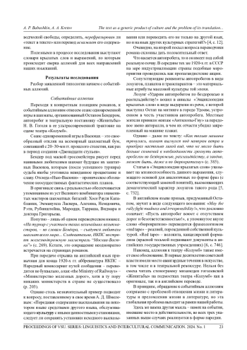 Статья посвящена анализу художественного текста как культурного явления, а также восприятию этого текста в координатах «чужой» культуры. Авторы обращаются к переводам на английский язык текстовых аллюзий в романах И. Ильфа и Е. Петрова «Двенадцать стульев» и «Золотой теленок», понимая под словом «аллюзия» мысленную отсылку читателя к культурным событиям реальной жизни, произведениям литературы и искусства, включая в рамки последнего и музыку. В результате объектом разбора становятся аллюзии четырех типов: событийные, литературные, художественноизобразительные и музыкальные. Перевод аллюзий на английский язык (и часто практикуемый обратный перевод) свидетельствует о том, что все эти отсылки в основном утрачивают свой культурный потенциал, подвергаясь перефразировке или искажению. Особое внимание в работе уделяется музыкальным аллюзиям. Если текст песни можно перевести с одного языка на другой, то в традиционном бумажном формате его музыкальное сопровождение оказывается непереводимым. Авторы предлагают революционизировать формат перевода. Благодаря информационным технологиям сегодня активизируются электронные и аудиокниги, в которых вполне реально использовать не только музыкальные аллюзии, но и визуальные. Интерес представляет обращение к языковой личности главного героя повествования, так как ранее фигура Остапа Бендера с этих позиций не изучалась.