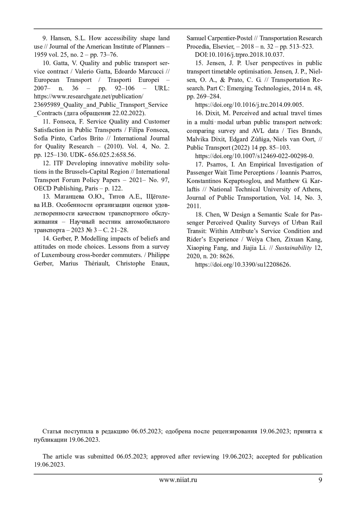 10. Gatta, V. Quality and public transport service contract / Valerio Gatta, Edoardo Marcucci // European Transport / Trasporti Europei – 2007– n. 36 – рр. 92–106 – URL: https://www.researchgate.net/publication/ 23695989_Quality_and_Public_Transport_Service _Contracts (дата обращения 22.02.2022).