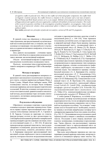 В статье описываются возможные подходы к понятию и типологии поликодовых текстов в современной лингвистике. Обсуждаются сложности, возникающие при работе с поликодовым текстом разных типов. Рассматриваются принципиальные отличия поликодовых текстов, которые должны определять методики работы с ними. Предлагается выделять жанры поликодовых текстов с преобладанием художественного эффекта, политического и пропагандистского эффекта, рекламного эффекта, эффекта личного пространства. Эти типы могут предполагать дальнейшую группировку в зависимости от цели создания, расширенных функций, прагматического эффекта, способов производства и распространения, контекста, географии и других факторов. В качестве одного из методологических решений при анализе поликодового текста мы предлагаем выделение когнитивного конфликта, когда художественный эффект получается за счет столкновения двух систем и определенной неожиданности нового продукта. Способы проявления когнитивного конфликта в поликодовом тексте зависят от жанровых характеристик, функций текста, его прагматики. В данной статье описаны три типа когнитивного конфликта в поликодовом тексте. Это конфликт вербального и графического компонента, конфликт на языковой игре, конфликт, создаваемый за счет карикатурной ситуации и реального положения дел. Данные положения проиллюстрированы на примере карикатуры на Барака Обаму и Риши Сунака. В качестве основных методов в исследовании используются лингвокультурный, когнитивно-дискурсивный методы, дополненные методиками структурной семантики. Результаты исследования вносят вклад в разработку проблем политической метафорологии, прагматики текста. Некоторые результаты и выводы будут полезны ученым, занимающимся проблемами культурологии и лингвокультурологии, политологии.