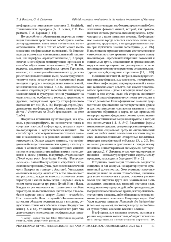 В статье анализируются официальные вторичные номинации топонимов Германии, под которыми понимаются дополнительные обозначения к названиям городов, утверждаемые на официальном уровне. Данные единицы формируют отдельный пласт топонимической лексики. В статусе официальных дополнительные именования населенных пунктов получают право функционировать в официальной коммуникации, в частности, в сфере междугородного сообщения, важным элементом которой являются дорожные указатели. Неотъемлемой частью официального наименования географического объекта являются дополнительные обозначения, представленные на дорожных указателях Германии, которые часто формируют наиболее значимую часть семантики после прямого адресно-указательного значения официального наименования топообъекта. Анализ законодательных актов федеральных земель Германии позволил выделить две группы мотивирующих признаков, которые легли в основу номинации дополнительных обозначений топообъектов, используемых официально. К первой группе были отнесены так называемые повторяющиеся признаки, связанные с административным статусом топообъекта, историческим событием, статусом города-курорта, центром научной и студенческой жизни. Значительное количество дополнительных именований топообъектов имеет антропонимическую основу, поскольку связано с именами известных исторических личностей, изобретателей, деятелей культуры и искусства. Вторая группа мотивации носит единичный уникальный характер топообъекта. В данном случае города и общины закрепляют на официальном уровне дополнительные обозначения, отражающие уникальный вид деятельности региона, достижения в области науки, географические и природные особенности, традиционные мероприятия в области культуры и искусства. Отдельные населенные пункты получают одинаковые вторичные номинации, поскольку имеют общие особенности в развитии инфраструктуры, другие, наоборот, приобретают уникальные дополнительные именования. Официально зарегистрированные вторичные номинации, формируя геокультурное пространство, являются хранителями исторической и культурной памяти конкретного населенного пункта. Они аккумулируют в себе лингвистическую, энциклопедическую и лингвострановедческую информацию.