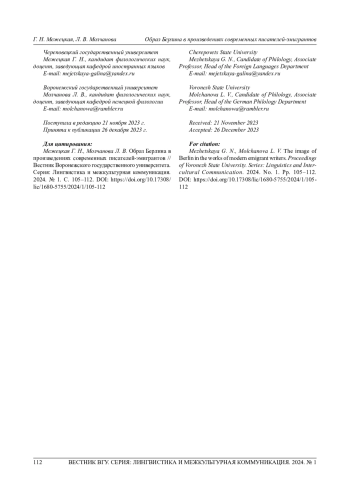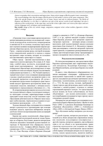 Предлагаемое исследование посвящено рассмотрению образа Берлина в немецкой художественной литературе писателей, эмигрировавших в Германию в 90-е гг. XX в. Цель данной статьи - рассмотреть, как формируется художественный образ города Берлина в произведениях двух писателей-эмигрантов: В. Каминера и К.-Ф. Банчу, выявить, как авторы определяют основные параметры понятия «город Берлин», а также раскрывают систему оппозиций, которые организуют комплексный образ города Берлина, таких как город как взаимодействие и противостояние культур Восточной и Западной Европы, их национальная специфика, проявляющаяся во всех сферах жизни и деятельности человека, а особенно иммигрантов, особенности столичной жизни, жители Берлина, которые неотделимы от города и формируют его образ, а берлинцы - это и рожденные в этом городе, и эмигранты, и беженцы. В фокусе исследования находятся и языковые средства, которые выбирают авторы для воспроизведения своих эмоциональных ассоциаций и впечатлений. Некоторые художественные образы Берлина приобретают иронические коннотации. Результаты исследования показали, что образ Берлина обоих авторов складывается из одинаковых составляющих. В них отражается специфика конкретного города, его статус, история и только ему присущие черты. Берлин В. Каминера и К.-Ф. Банчу - это город, который является отражением не только узкого мирка каждого индивида, но и отражением национальной картины мира. При этом каждый предлагает свое видение объекта и использует различные языковые средства, приемы и трансформации.