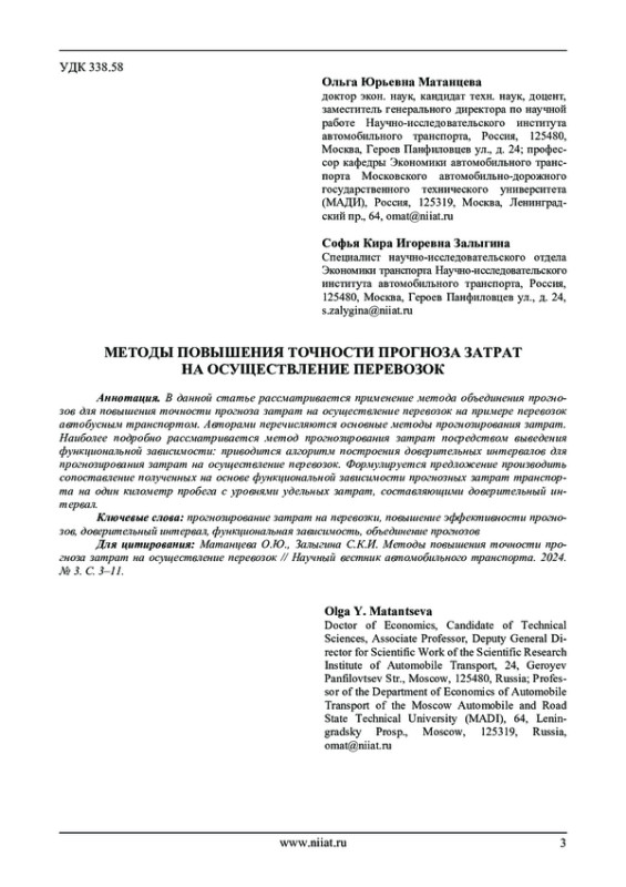 В данной статье рассматривается применение метода объединения прогнозов для повышения точности прогноза затрат на осуществление перевозок на примере перевозок автобусным транспортом. Авторами перечисляются основные методы прогнозирования затрат. Наиболее подробно рассматривается метод прогнозирования затрат посредством выведения функциональной зависимости: приводится алгоритм построения доверительных интервалов для прогнозирования затрат на осуществление перевозок. Формулируется предложение производить сопоставление полученных на основе функциональной зависимости прогнозных затрат транспорта на один километр пробега с уровнями удельных затрат, составляющими доверительный интервал