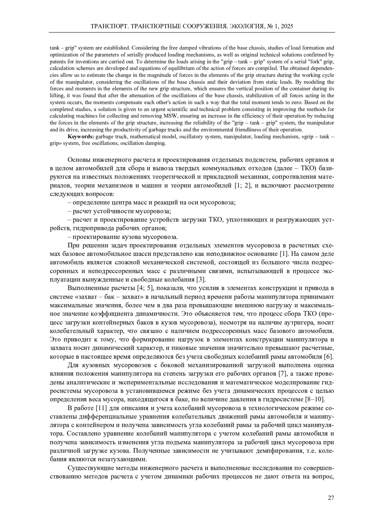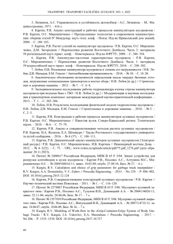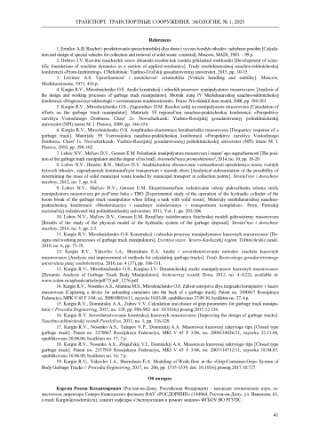 Обоснована актуальность проведения исследования динамического характера рабочих процессов кузовных мусоровозов с учетом свободных колебаний рамы автомобиля. Обобщены результаты исследований влияния конструктивного исполнения манипуляторов кузовных мусоровозов с боковой загрузкой на формирование усилий в конструктивных элементах мусоровоза при взаимодействии их с нагрузкой, создаваемой весом контейнера при выполнении рабочих операций: подъем, опрокидывание, опускание. Составлена модель и приведена расчетная схема мусоровоза как колебательной системы. Определен характер колебаний рамы мусоровоза в рабочем режиме. Установлены закономерности формирования усилий в системе «захват - бак - захват». С учетом свободных затухающих колебаний базового шасси выполнены исследования формирования нагрузок и оптимизация параметров серийно выпускаемых механизмов загрузки, а также оригинальных технических решений, подтвержденных патентами на изобретения. Для определения нагрузок, возникающих в системе «захват - бак - захват» серийного «вилочного» захвата, разработаны расчетные схемы и составлены уравнения равновесия действия сил. Полученные зависимости позволяют оценить изменение величины усилий в элементах конструкции захвата за рабочий цикл работы манипулятора с учетом колебаний базового шасси и их отклонение от статических нагрузок. Моделированием сил и моментов в элементах новой конструкции захвата, обеспечивающей вертикальное положение контейнера в процессе его подъема, установлено, что после затухания колебаний базового шасси происходит стабилизация всех сил, действующих в системе, моменты компенсируют действие друг друга таким образом, что суммарный момент стремится к нулю. На основании выполненных исследований дано решение актуальной научно-технической задачи, состоящей в совершенствовании методов расчета машин для сбора и вывоза твердых коммунальных отходов, обеспечивающих повышение эффективности их эксплуатации за счет снижения усилий в элементах конструкции захвата, повышения надежности системы «захват - бак - захват» манипулятора и его привода, повышения производительности мусоровозов и экологичности их работы.