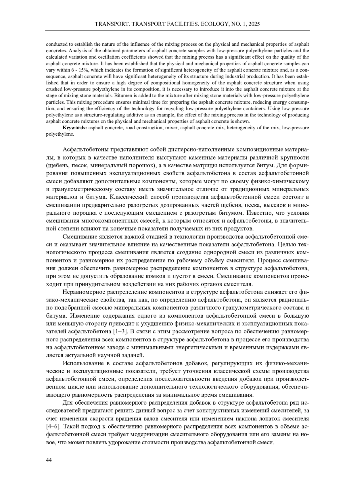 Асфальтобетоны представляют собой композиционный материал, состоящий из минеральных материалов различного гранулометрического состава и битума. Для регулирования физико-механических и эксплуатационных показателей асфальтобетонов в состав асфальтобетонной смеси вводят дополнительные компоненты. Использование в составе асфальтобетонов различных добавок требует уточнения классической схемы производства асфальтобетонной смеси, определения последовательности введения добавки и технологических режимов ее производства. В большинстве опубликованных работ по использованию структурорегулирующих добавок в составе асфальтобетона не рассматриваются вопросы технологии производства асфальтобетонной смеси. Как правило, в исследованиях указаны полученные результаты без упоминания технологических режимов, в том числе очередности смешивания компонентов. На примере использования измельченных отходов полиэтилена низкого давления в качестве структурорегулирующей добавки проведено исследование по установлению характера влияния на физико-механические показатели асфальтобетонов процесса смешивания. Анализ полученных показателей асфальтобетонных образцов с частицами полиэтилена низкого давления и вычисленные коэффициенты вариации и осцилляции показали, что на качество асфальтобетонной смеси процесс смешивания оказывает значительное влияние. Установлено, что физико-механические показатели образцов асфальтобетона могут варьироваться в пределах 6-15 %, что указывает на формирование существенной неоднородности асфальтобетонной смеси и, как следствие, асфальтобетон будет иметь значительную неоднородность своей структуры при промышленном выпуске. Установлено, что для обеспечения высокой степени композиционной однородности структуры асфальтобетона при использовании в его составе измельченного полиэтилена низкого давления необходимо его вводить в состав асфальтобетонной смеси на этапе смешивания каменных материалов. Битум добавляется в смесь после перемешивания каменных материалов с частицами полиэтилена низкого давления. Такой порядок смешивания обеспечивает минимальное время приготовления асфальтобетонной смеси, снижение потребления энергетических ресурсов, обеспечение эффективности технологии утилизации тары из полиэтилена низкого давления. На примере использования полиэтилена низкого давления в качестве структурорегулируюшей добавки показано влияние процесса смешивания в технологии производства асфальтобетонных смесей на физико-механические свойства асфальтобетона.