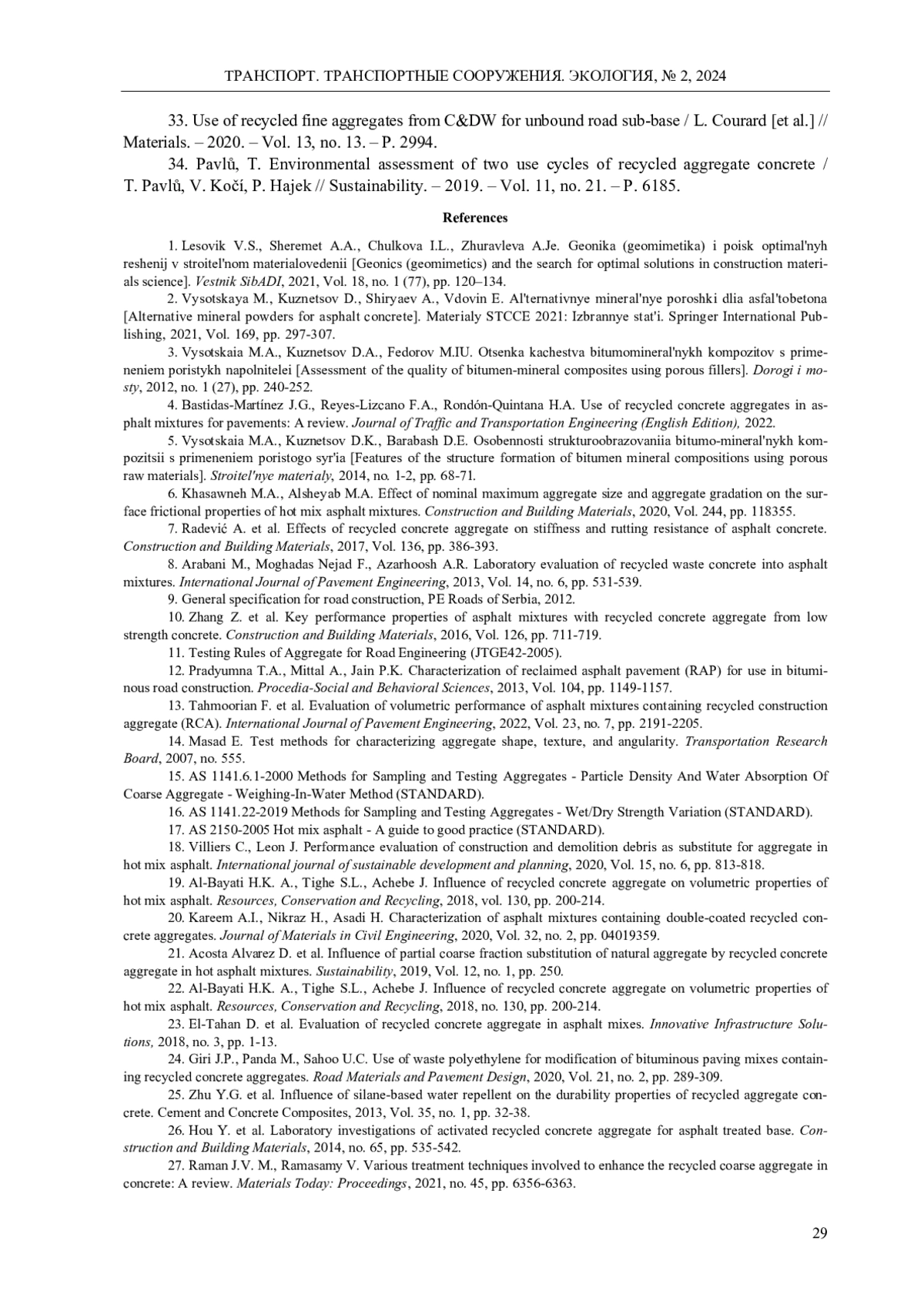 33. Pavlů, T. Environmental assessment of two use cycles of recycled aggregate concrete / T. Pavlů, V. Kočí, P. Hajek // Sustainability. - 2019. - Vol. 11, no. 21. - P. 6185.