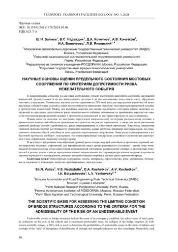 ВАЛИЕВ Ш. Н., НАДЕЖДИН В. С., КОЧЕТКОВ Д. А., КОЧЕТКОВ А. В., БОЛЯЧЕВЕЦ И. А., ЯНКОВСКИЙ Л. В. НАУЧНЫЕ ОСНОВЫ ОЦЕНКИ ПРЕДЕЛЬНОГО СОСТОЯНИЯ МОСТОВЫХ СООРУЖЕНИЙ ПО КРИТЕРИЯМ ДОПУСТИМОСТИ РИСКА НЕЖЕЛАТЕЛЬНОГО СОБЫТИЯ // ТРАНСПОРТ. ТРАНСПОРТНЫЕ СООРУЖЕНИЯ. ЭКОЛОГИЯ. 2024. № 3