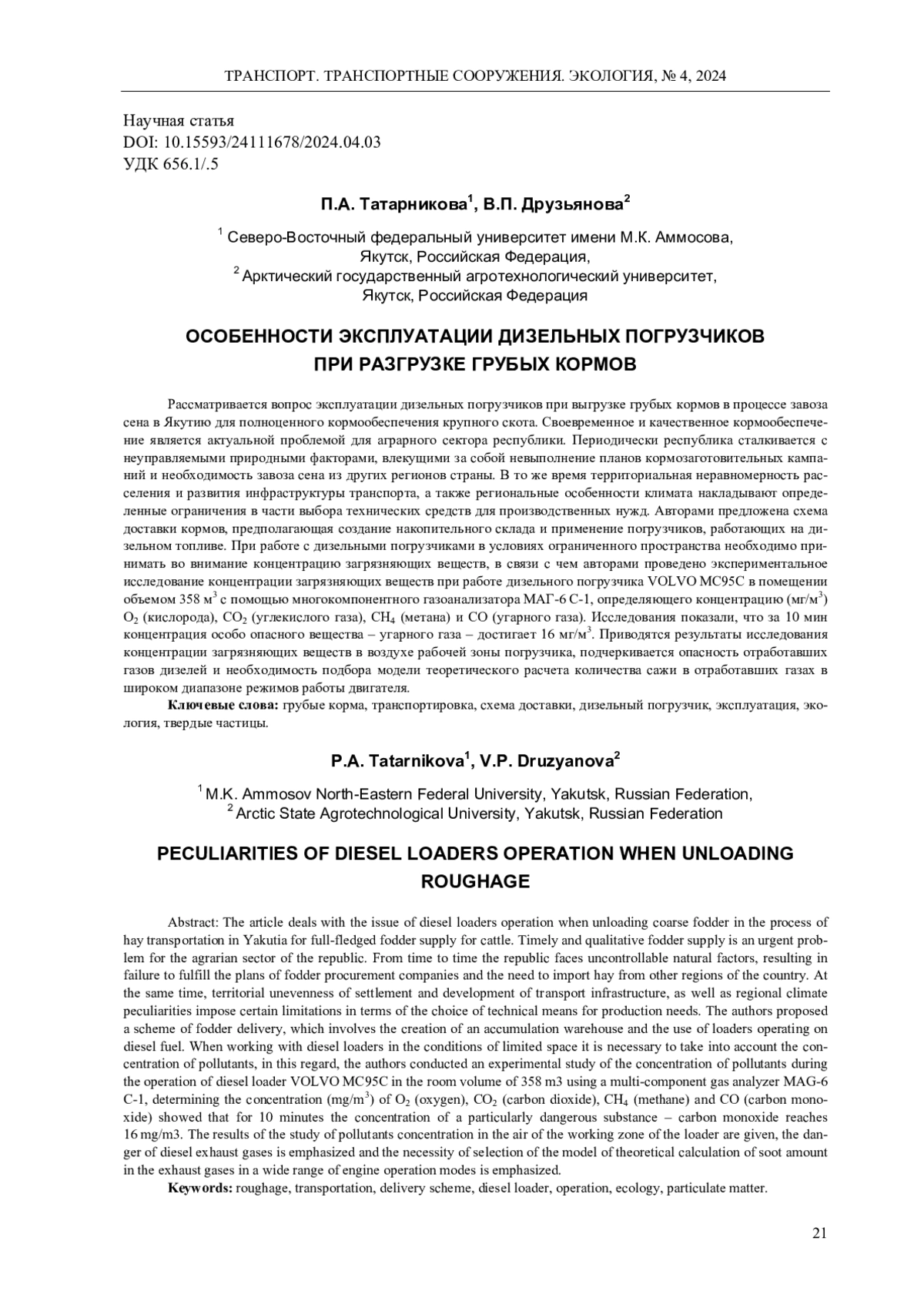Рассматривается вопрос эксплуатации дизельных погрузчиков при выгрузке грубых кормов в процессе завоза сена в Якутию для полноценного кормообеспечения крупного скота. Своевременное и качественное кормообеспечение является актуальной проблемой для аграрного сектора республики. Периодически республика сталкивается с неуправляемыми природными факторами, влекущими за собой невыполнение планов кормозаготовительных кампаний и необходимость завоза сена из других регионов страны. В то же время территориальная неравномерность расселения и развития инфраструктуры транспорта, а также региональные особенности климата накладывают определенные ограничения в части выбора технических средств для производственных нужд. Авторами предложена схема доставки кормов, предполагающая создание накопительного склада и применение погрузчиков, работающих на дизельном топливе. При работе с дизельными погрузчиками в условиях ограниченного пространства необходимо принимать во внимание концентрацию загрязняющих веществ, в связи с чем авторами проведено экспериментальное исследование концентрации загрязняющих веществ при работе дизельного погрузчика VOLVO MC95C в помещении объемом 358 м3 с помощью многокомпонентного газоанализатора МАГ-6 С-1, определяющего концентрацию (мг/м3) O2 (кислорода), CO2 (углекислого газа), CH4 (метана) и CO (угарного газа). Исследования показали, что за 10 мин концентрация особо опасного вещества - угарного газа - достигает 16 мг/м3. Приводятся результаты исследования концентрации загрязняющих веществ в воздухе рабочей зоны погрузчика, подчеркивается опасность отработавших газов дизелей и необходимость подбора модели теоретического расчета количества сажи в отработавших газах в широком диапазоне режимов работы двигателя.
